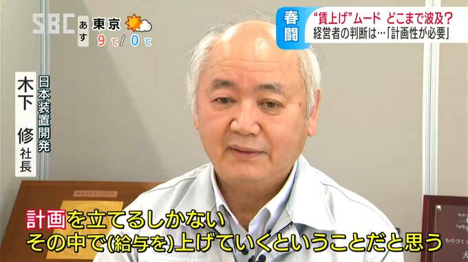 「賃上げ」の流れ…企業トップはどう見る?「計画の中で道筋をつけて実行していく…」経営者は難しい判断迫られる 2024年2月6日(火) 18:31 国内 企業の経営者は難しい判断を迫られています。日本装置開発・木下修(きのしたおさむ)社長:「いま、中小企業って『利益があったから給料上げる』ってできないと思う。計画立てるしかない。その中で上げていくって…