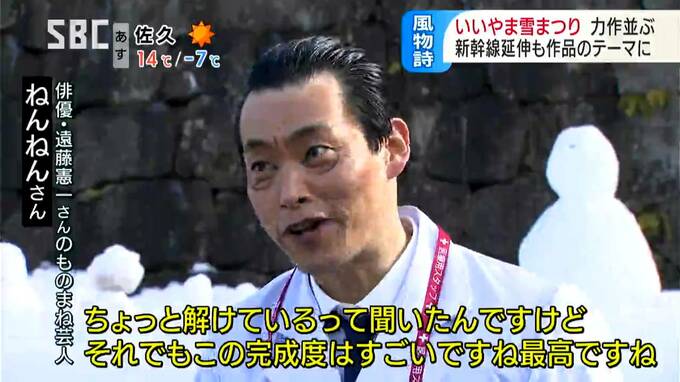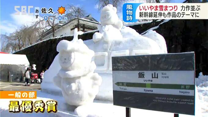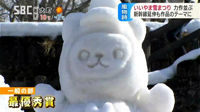 雪像コンテスト「一般の部」で最優秀賞に選ばれたのは、新幹線の上にアルクマが乗るこちらの作品。