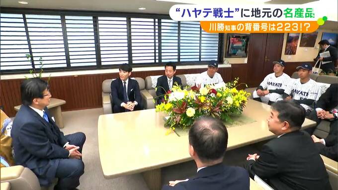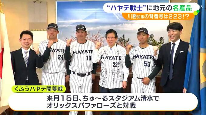 静岡県内初のプロ野球チーム「くふうハヤテベンチャーズ静岡」の開幕戦まで1か月を切りました。2月19日は、選手たちに地元の名産品が贈られた一方、静岡県の川勝平太知事には名前入りのユニフォームが贈呈されました。