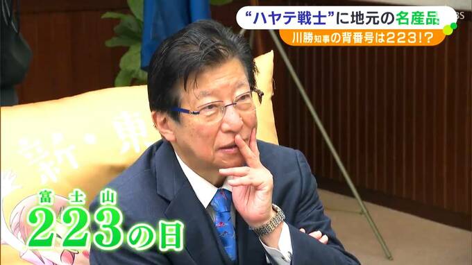 さらに、川勝知事が喜ぶサプライズが。チームから贈呈されたのは選手のサインが入ったユニホーム!背中には「KAWAKATSU」の文字。背番号は223…富士山です。