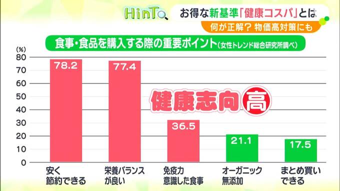 女性トレンド総合研究所の調査によると、「今よりもお金をかけたい」項目の上位に「食」「健康」がランクイン。また、「食事・食品を購入する際の重要なポイントは」という問いでは、「価格が安く、節約ができる」が78.2%「栄養バランスがいい」が77.4%と健康志向は高いことがわかります。