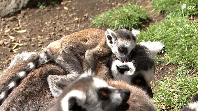 母親の背中に一生懸命しがみついているのがワオキツネザルの赤ちゃんです。伊豆シャボテン動物公園では、2月から双子を含む4匹の赤ちゃんが生まれました。ワオキツネザルは、取材のカメラに興味津々。好奇心旺盛な性格です。