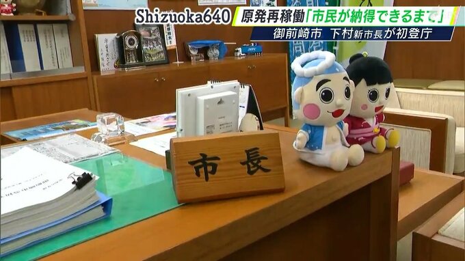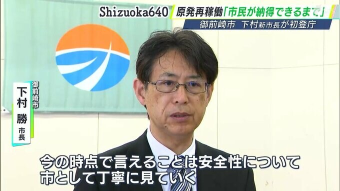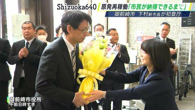 4月14日に投開票が行われた静岡県の御前崎市長選挙で当選した下村勝新市長が18日朝、市役所に初登庁しました。浜岡原発の再稼働については「自ら安全性を丁寧に確認し、市民の意見をしっかりと聞く」と、これまでの市政と同じスタンスを示しました。