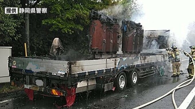 警察によりますと、24日午後1時半頃、小山町竹之下の東名高速道路下り線で、登坂車線を走行中の大型トラックから火が出ました。燃えた大型トラックは、58歳の男性が運転をしていましたが、けがはありませんでした。