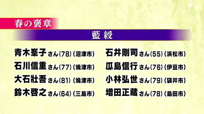 また、会社経営などを通じて産業振興に優れた業績を上げたり、公共の利益のために尽くしたりした人に贈られる「藍綬褒章」は、保護司で沼津市の青木峯子さん、浜松市消防団分団長の石井剛司さんなど8人が受章しました。