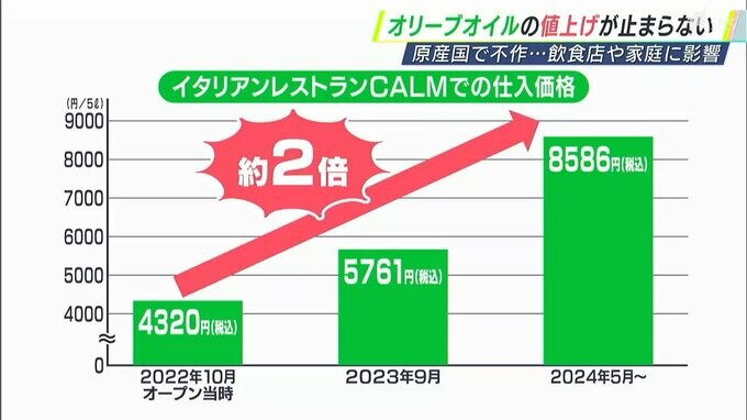 1年半前にリニューアルオープンした当時、オリーブオイルは5リットルで4300円ほどでしたが、2024年5月、約2倍の8600円まで値上がりしました。