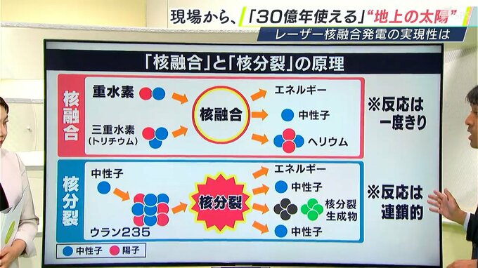 レーザー核融合発電はレーザーを照射することで毎回エネルギーを生み出すので制御が可能です。一方、原発で用いられている核分裂反応は、一度動き始めると反応が連鎖するため制御が難しいという側面があります。制御できず暴走した原発は大事故につながるリスクが高く、核融合の方が安全だと考えられています。