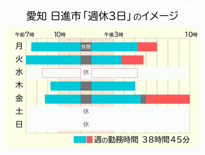 日進市は24年7月、午前7時〜午後10時の間で4〜12時間働き、週に38時間45分の勤務を満たせばいい「フレックスタイム制」を導入する。1時間の休憩を挟み、午前10時〜午後3時の4時間は必ず勤務する。週に1日は勤務しなくてもいい日を設けることで、週休3日を可能にする。