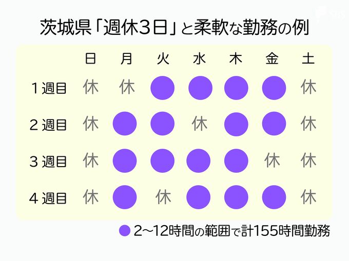 茨城県は24年4月から週休3日を選べるだけでなく、さらに柔軟なフレックスタイム制を導入している。午後1〜3時の最低2時間は働くことを条件に、1日の勤務時間を2〜12時間の範囲で設定し、4週間で合計155時間勤務して帳尻を合わせる。週に1日、勤務しなくてもいい日がある。