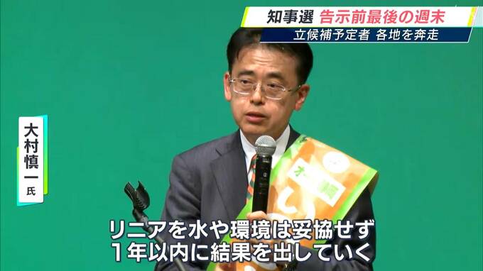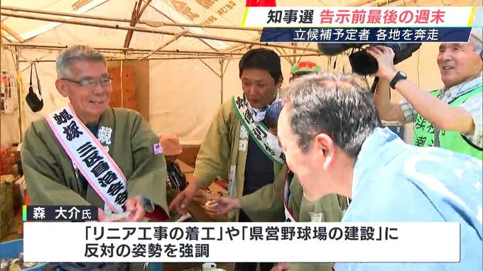 「リニア工事の着工」や「県営野球場の建設」に反対のスタンスを強調し、ほかの立候補予定者との違いを明確にします。