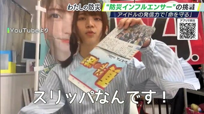 ファンや同世代の命を守るために切り開いたのは防災アイドルという新ジャンル。主な舞台は、動画配信です。新聞紙で作ったスリッパや推し活には欠かせないペンライトとペットボトルを組み合わせたランタン。家庭でもできる手作り防災グッズだけでなく、避難所での過ごし方など、災害時に役に立つ身近な情報を発信します。