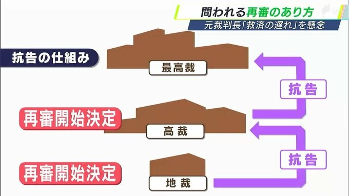 再審制度の問題点とされている一つが「検察側の抗告」です。検察が裁判所の決定に不服を申し立てて抗告すると地裁での審理は高裁に、高裁での審理は最高裁に移ることになります。