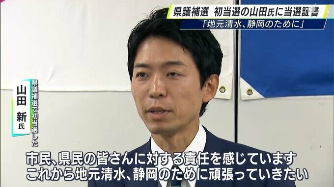 静岡県議会議員(静岡市清水区)補欠選挙で当選した新人の山田新氏は5月28日、当選証書を受け取りました。山田氏は「県民に対する責任を感じる」と思いを語りました。