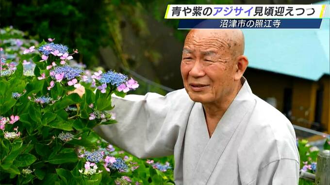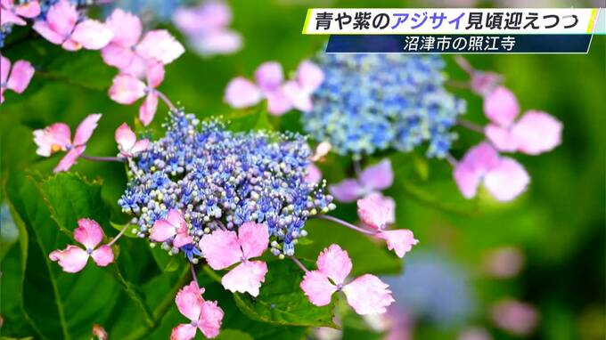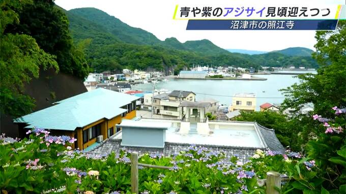 静岡県沼津市の照江寺では、アジサイが見頃を迎えつつあり、色とりどりの花を咲かせています。