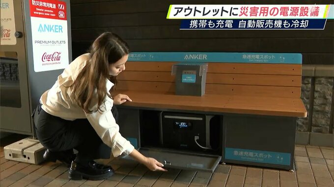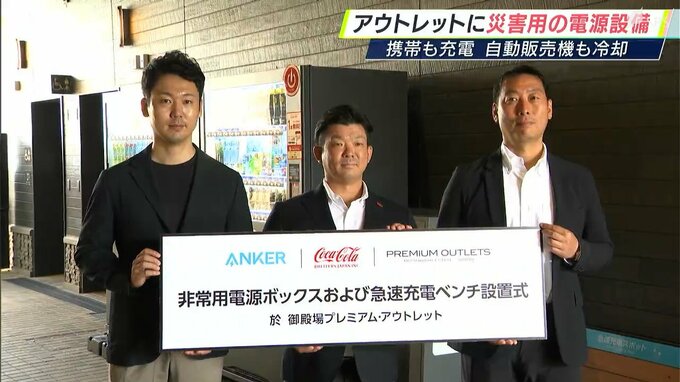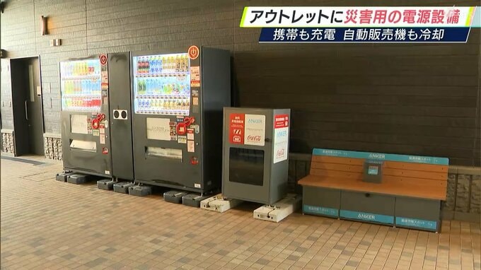 今回は、バッテリーメーカーと飲料メーカー、アウトレットの3社が共同で災害で停電した時でも電源を確保する環境を整備しようとプロジェクトを組み、自動販売機を動かすための災害用電源ボックスも配備しました。