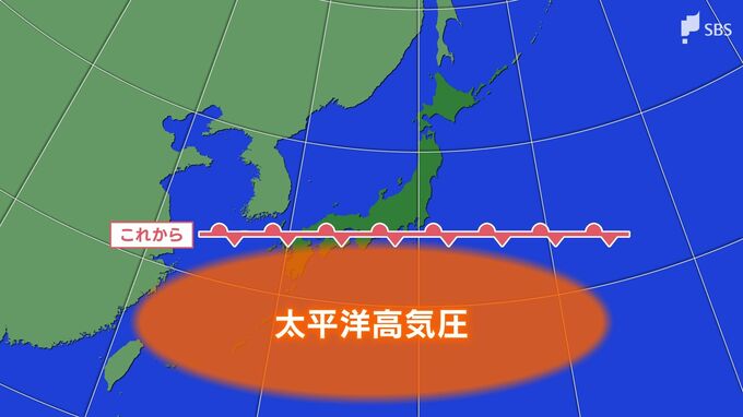 2024年の東海地方の梅雨入りが6月21日と平年より15日遅くなった理由は、夏の空気の勢力がなかなか強まってこなかったためです。これまで梅雨前線の南にある夏の空気のエリア=太平洋高気圧は東西に勢力を強めていました。やっとこの高気圧が北への勢力を強めてきたので、前線が北上して梅雨が始まったということになります。