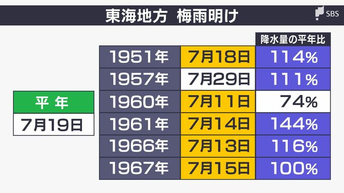 1951年以降、70年以上の歴史の中で過去6回しかありませんでした。最後の年が1967年でしたので、57年ぶりのこととなります。それぞれの年には共通した特徴がありました。梅雨入りはとても遅かったのに、梅雨明けは平年の7月19日頃より早かった年がほとんどでした。