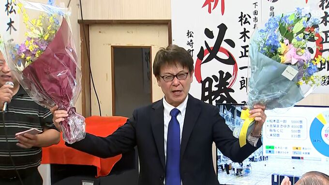 三つ巴となった下田市長選は23日、現職の松木正一郎さんが約5,200票を獲得、元副知事の新人候補に競り勝ち2度目の当選を果たしました。