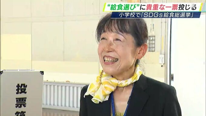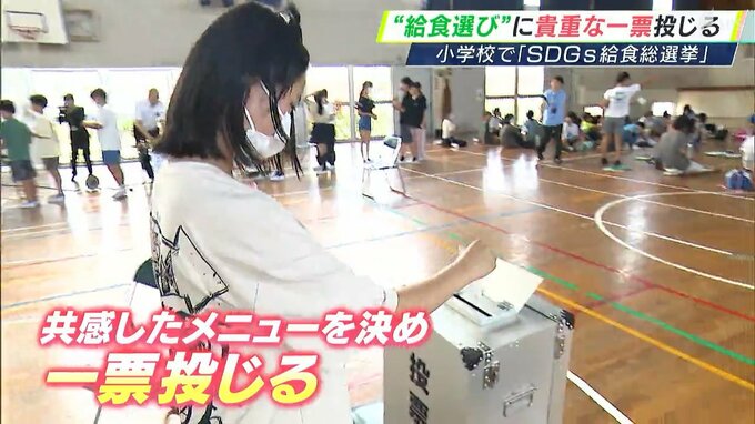 模擬選挙には3人が立候補し、それぞれがSDGsを意識したメニューを政見放送でアピール。真剣な表情で立候補者の訴えを聞いた児童たちは、最も共感したメニューを決めて一票を投じました。