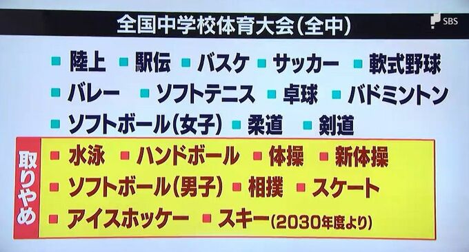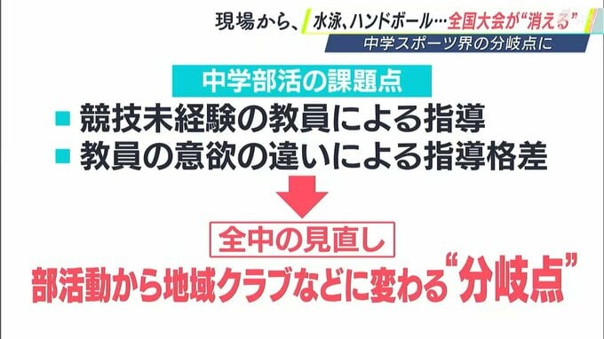 2024年度の全国中学校体育大会、いわゆる「全中」で行われる20競技。このうち、9つの競技について、中体連は3年後から除外、すなわち、全国大会をなくすという方針を示しました。静岡県内の中学生や指導者からは落胆の声が聞かれる一方で、専門家は中学スポーツ界における分岐点だと話します。