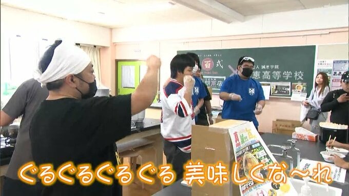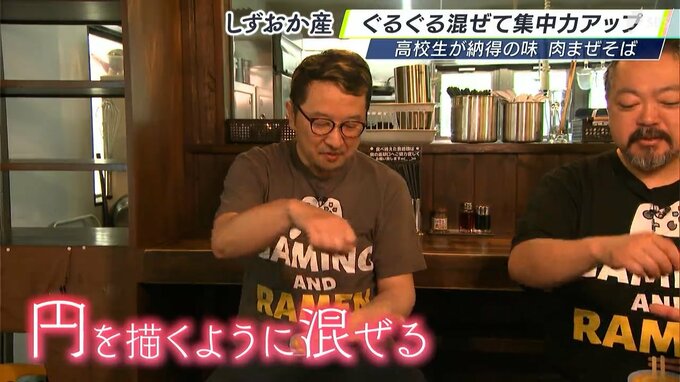 「最初は円を描くように『ぐるぐるぐるぐるおいしくなーれ』をやって、今度は縦回転で『ぐるぐるぐるぐるおいしくなーれ』それを2セットやって完成。ちょうどスープと油の割合が混ぜることによって乳化されて麺に絡みやすくなるっていう感じでおいしさが倍増するような感じ」