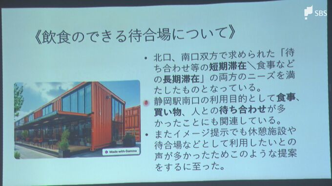 大学生からは静岡県内の大学でのアンケートをもとに、コンテナを活用した待ち合わせ場所や休憩スペースなどといった若者目線からの要望も提案されました。