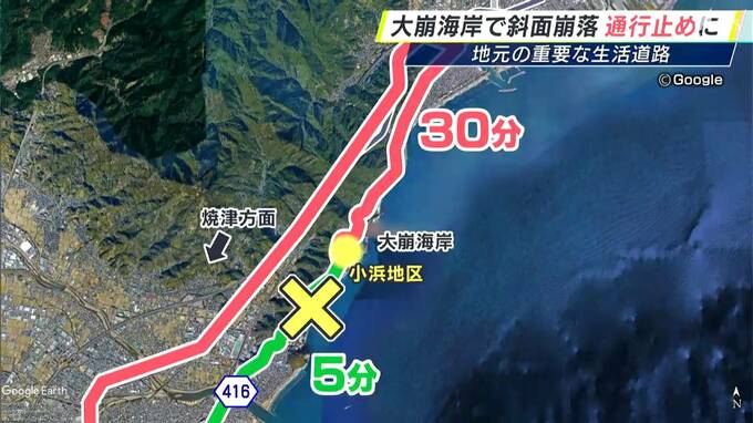 崩落現場近くの小浜地区に住む人はこの道路を使えば、焼津市街地まで5分程度で行くことができました。しかし、崩落による通行規制の影響で、静岡市側へ迂回しなければならず、30分ほどかかってしまいます。