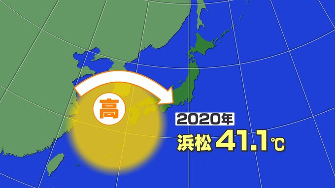 ちなみに浜松で2020年41度まで上がった時は、高気圧の中心が西にありました。すると、西風が吹いてきます。浜松には愛知県などの山を越えた熱風がやってきて、記録的な高温となりました。
