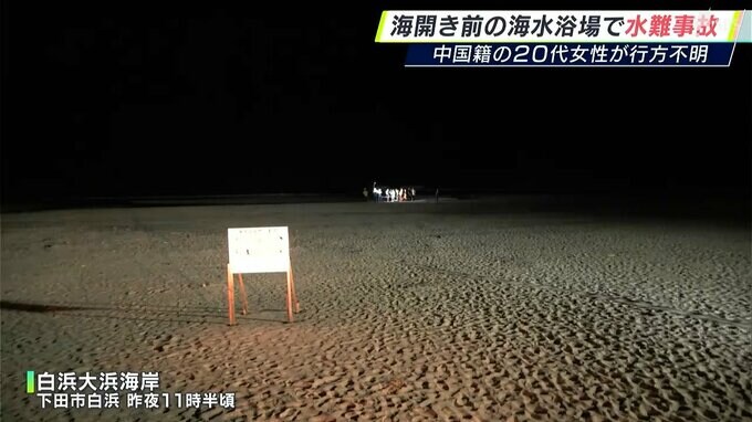 9日夜8時前、静岡県下田市の白浜大浜海水浴場で「友人が海に入ったあと戻ってこない」と外国人女性から警察に通報がありました。行方不明になったのは中国籍の20代の女性で、黒色の水着を着用していたということです。