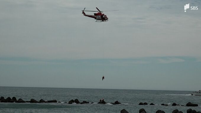 「消防のヘリから隊員が要救助者の方に向かって降りていきます。やや強めの南西風が吹いていますが、要救助者を確保しました」