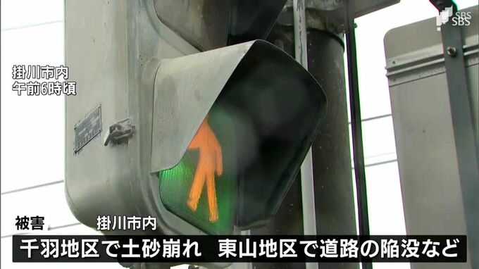 掛川市によりますと、この雨の影響で市内の千羽地区で土砂崩れが発生し、東山地区では道路の陥没などが確認されているということです。