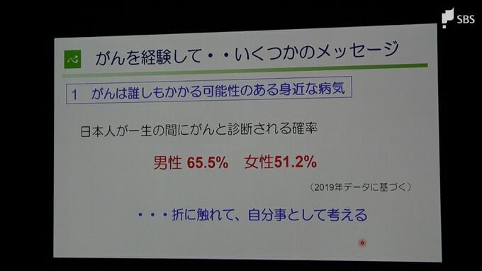 上坂総長は、がんは2人に1人の割合でかかる病気だとして、一人で悩みを抱えるのではなく、家族や友人、病院スタッフなど周囲の人と共に闘う大切さを強調しました。