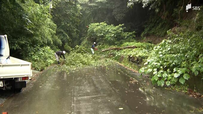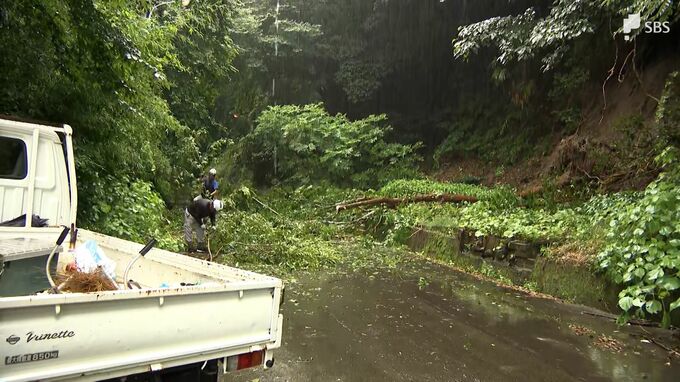 掛川市板沢では倒木が道をふさぎ、作業員が撤去作業にあたりました。