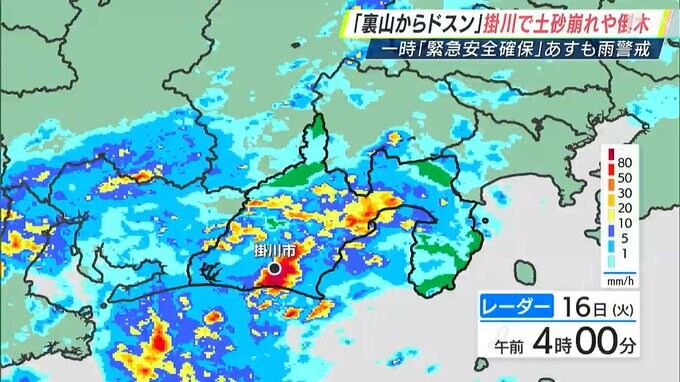 掛川市は午前5時頃、土砂災害発生の危険が高まったとして、一時、「緊急安全確保」を発令しました。(午前7時過ぎに解除)