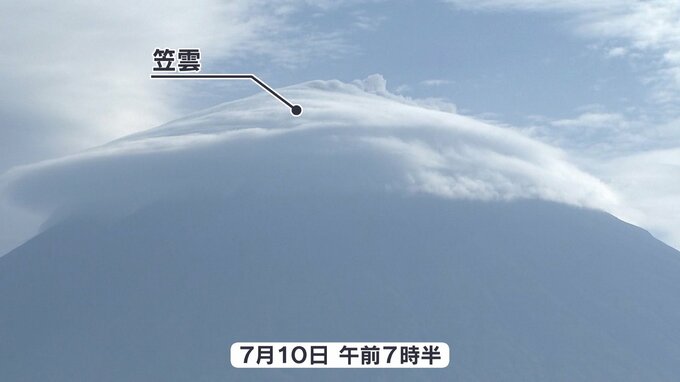 地上付近では穏やかな天気でも、山の上は荒れているということはよくあります。7月10日、山開きの朝の富士山の様子を映した画像を見ると、周りは晴れているものの、山頂付近には笠雲ができていました。