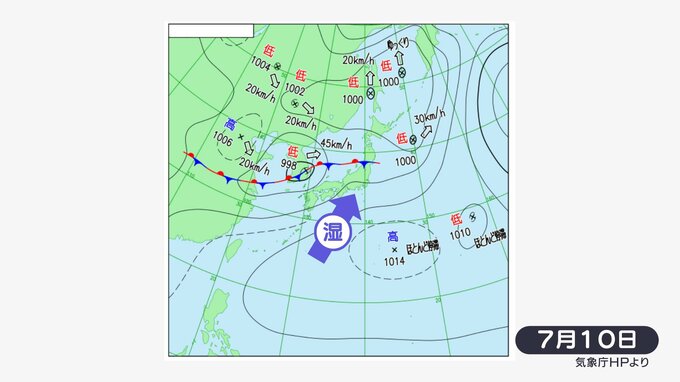 富士山で荒れた天気となりやすくなっている原因は梅雨前線。7月10日から16日にかけて、日本列島付近では、前線が停滞し続けています。富士山には湿った空気がぶつかりやすくなっています。
