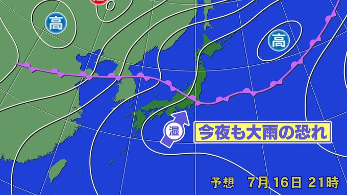 16日夜も大雨の恐れがあります。16日朝と比べると、前線は少し北上します。ただ、湿った空気の流れ込みが続き、17日明け方にかけて大雨に注意・警戒が必要です。
