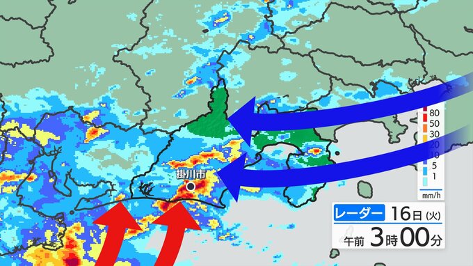 午前3時のレーダーの様子です。静岡県西部・中部を中心に雨雲が発達しました。線状降水帯とはならなかったものの、1時間から2時間、短時間で大量の雨が降りました。ちょうどこの時間帯、南風と北からやってきた風が西部でぶつかり続けていたためです。