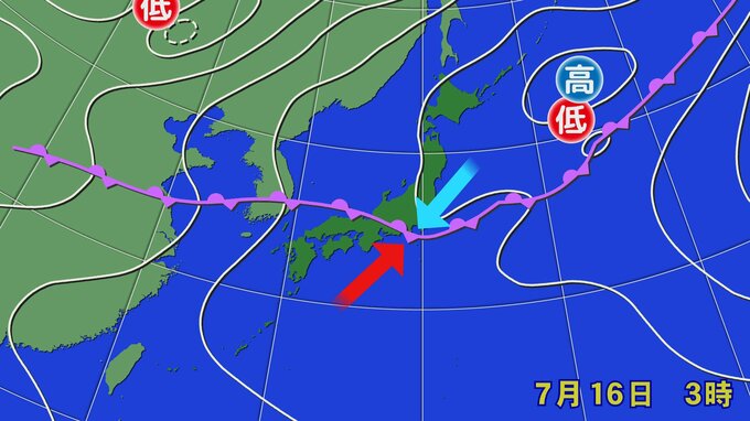 大雨の原因は梅雨前線です。7月16日午前3時の天気図を見ると、前線がちょうど静岡県の真上にかかっていました。前線は、北風と南風がちょうどぶつかるところです。静岡県では、風と風がぶつかって上昇気流が強まったため、雨雲が発達しました。