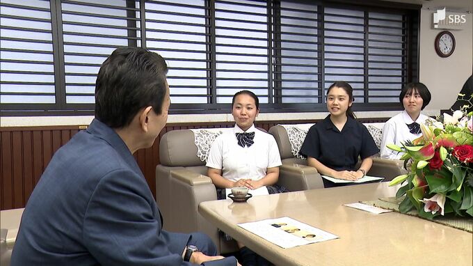 鈴木知事のもとを訪れたのは、高校生平和大使の谷河優那さん(東海大静岡翔洋高校3年)、長崎派遣代表の水野可麗さん(不二聖心女子学院高校2年)と粂田陽菜さん(榛原高校3年)の3人です。