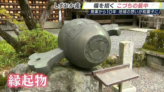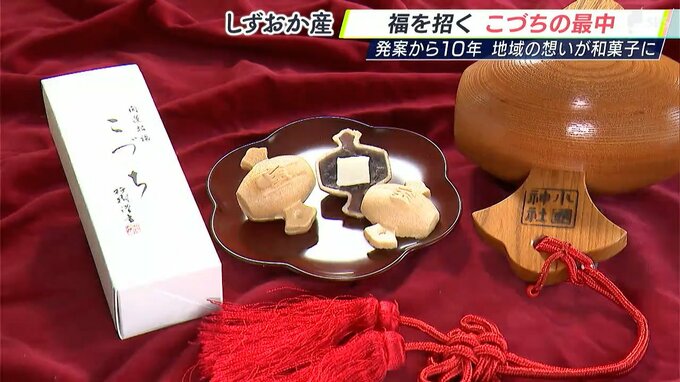 榊原さんは森町議時代の2014年、小國神社にちなんだ新しい名物を作ろうと打ち出の小槌の最中を発案。金型を業者に依頼し、打田宮司や地元の有志とともに、商品化にむけて奔走しました。