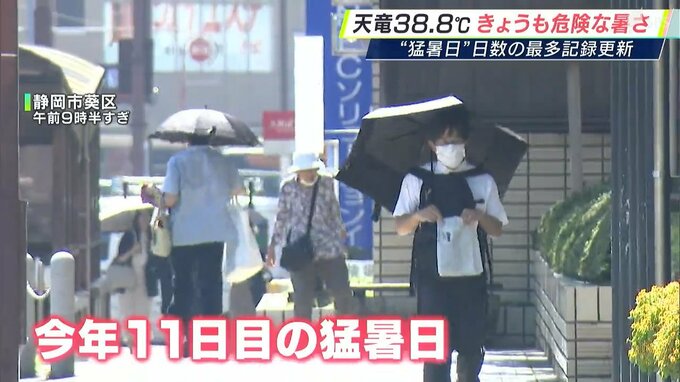 静岡市では、今年11日目の猛暑日となりました。これまで静岡市における年間の猛暑日日数は10日が最多だったため、22日で記録が塗り替えられましたが、今年はまだまだこの暑さが続きそうです。