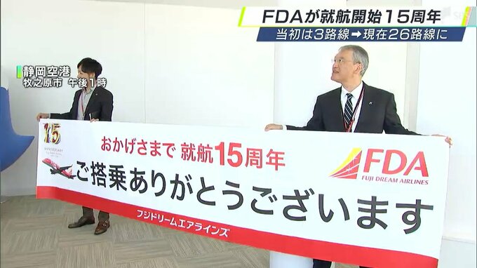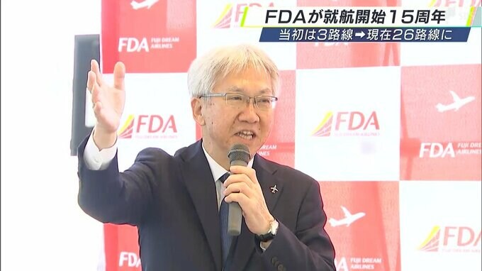 就航開始から15年の節目を迎えたFDA=フジドリームエアラインズ。静岡空港で開かれたセレモニーでは、楠瀬俊一社長が「みなさまのおかげでここまで来られた」と利用者に感謝の言葉を述べました。