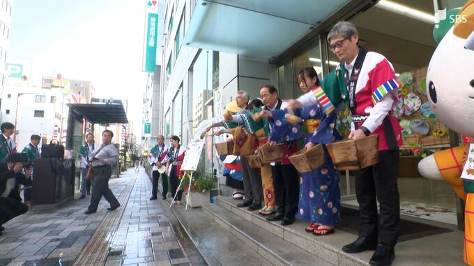 連日35度を超える猛暑日が続く中、静岡市では信用金庫の職員が浴衣姿で打ち水をして街に涼しさを届けました。
