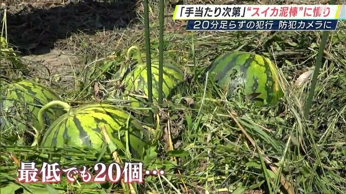 懐中電灯のようなものを片手に奥へと進んで行く不審者。片方の手に抱えていたのは大きなスイカです。“スイカ泥棒”の犯行の様子をとらえた防犯カメラの映像です。犯人は周りを気にするそぶりも見せず、20分足らずであわせて8個のスイカを堂々と盗んでいきました。