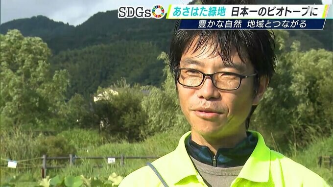 JR静岡駅から車で約20分。「あさはた緑地」は3年前に整備された公園です。6月、日本一のビオトープに輝きました。生態系の豊かさや環境を維持管理するシステム、教育の取り組みなどを審査する「ビオトープ顕彰」で初の応募にも関わらず、大賞を受賞しました。