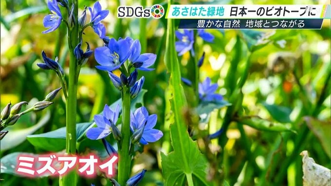 「ミズアオイ」は9月に見頃を迎え、青紫色の小さな花を咲かせます。同じく絶滅危惧種の「オニバス」なども確認されていて、展示や、植物を増やす取り組みが行われています。ビオトープ顕彰で特に評価された点は、公園と地域とのつながりです。サポーターに登録することで様々な活動に参加でき、幅広く公園を楽しむことができます。