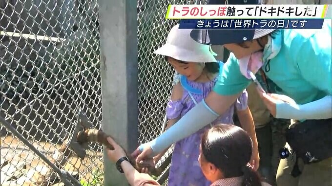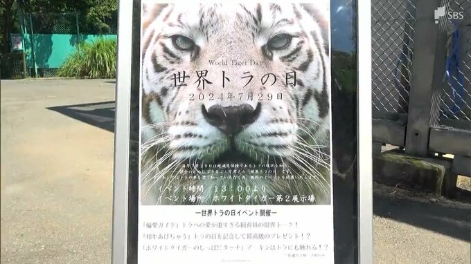 2010年に制定された「世界トラの日」。世界で約4000頭まで減っている絶滅危惧種の現状を知ってもらうことが目的です。4頭のホワイトタイガーを飼育している伊豆アニマルキングダムでは「目指せ!トラ博士」と題したイベントを開催。飼育スタッフが、オスで17歳の「ハクア」でトラについて解説したほか、参加者の中から選ばれた3組が、ハクアのしっぽに触れることができました。