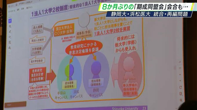 浜松医科大の今野学長は合意書に基づいた速やかな協議を求める姿勢を強く示し、「期成同盟会」も法人を1つに統合した上で静岡と浜松に2つの大学を再編する「1法人2大学」案を後押しする姿勢を改めて示しました。