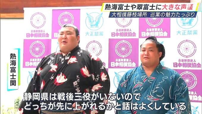 静岡県熱海市出身の熱海富士と焼津市出身の翠富士。色鮮やかな回しをつけた2人は、大きな声援を受けながら土俵入りしました。